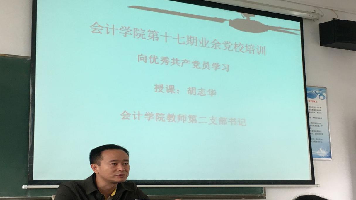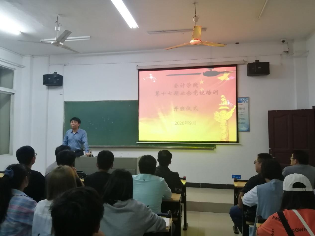 2020年9月24日下午6:30,太阳成集团tyc9728第十七期业余党校培训班在文华楼C303教室正式开班。出席培训班开班仪式的有会计公司党总支书记镇咸辉,太阳成集团tyc9728教师第一党支部书记刘毅,太阳成集团tyc9728教师第二党支部书记胡志华,太阳成集团tyc9728员工第一党支部书记徐俊杰,太阳成集团tyc9728员工第二党支部书记杨裕结,及太阳成集团tyc972866名入党积极分子参会。开班仪式由太阳成集团tyc9728团总支书记胡勇同志主持。