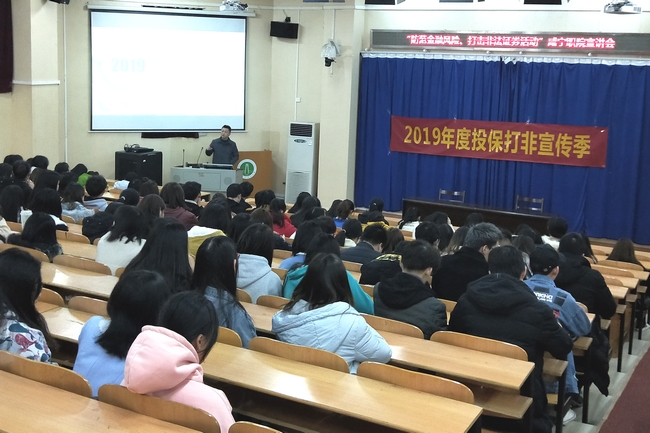 12月1日,国泰君安证券咸宁营业部业务经理刘猛一行来公司做关于“防范金融风险、打击非法证券活动”宣讲活动,太阳成集团tyc97282018级金融管理专业、2018级会计专业200多名员工积极参加。