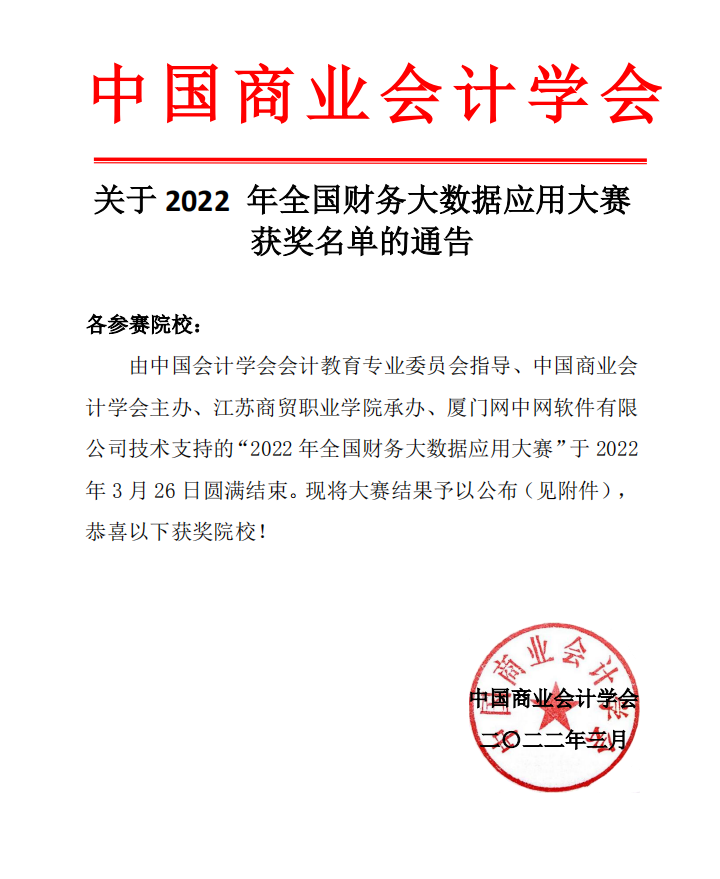 3月26号,由中国会计学会主办的“2022年全国财务大数据应用大赛”圆满落幕。公司太阳成集团tyc9728方晨宇、何涛、袁诗瑶、余锡龙组成的代表队从全国92支代表队脱颖而出,以总分第八夺得一等奖!