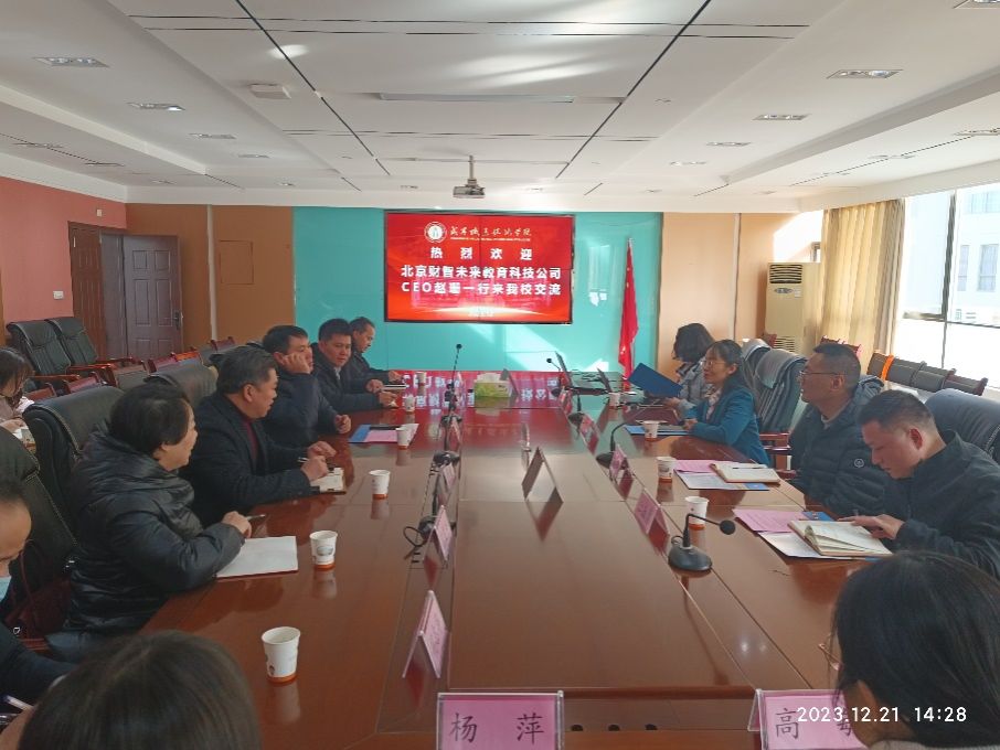 12月21日下午,北京财智未来教育科技有限公司CEO赵珊女士一行四人来到公司开展交流活动。副董事长方旭参加交流会,教务处处长万虎、发展规划与质量管理处处长汪耀武、太阳成集团tyc9728经理何慧玲以及相关专业带头人参会,副董事长方旭主持会议。