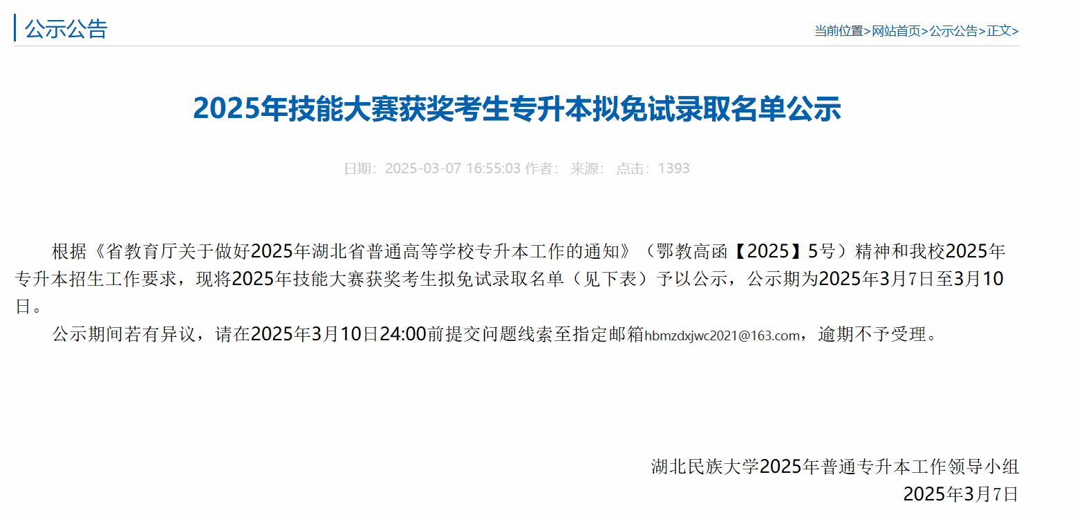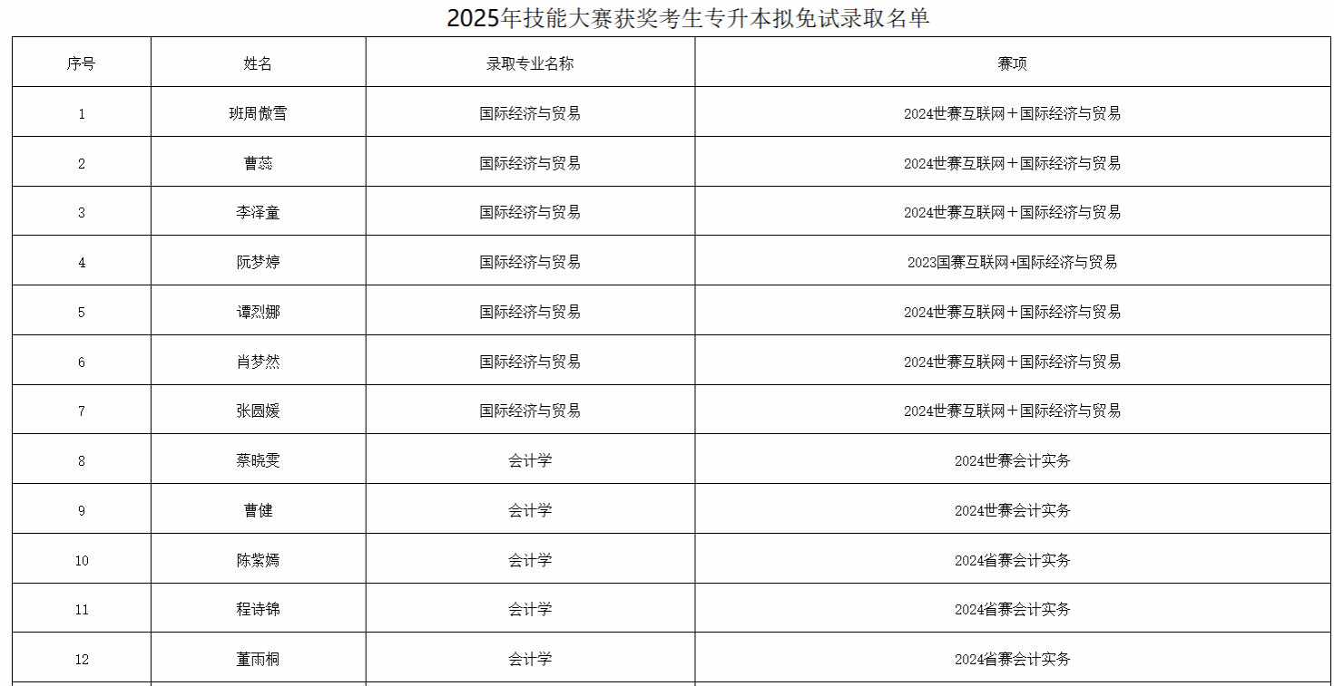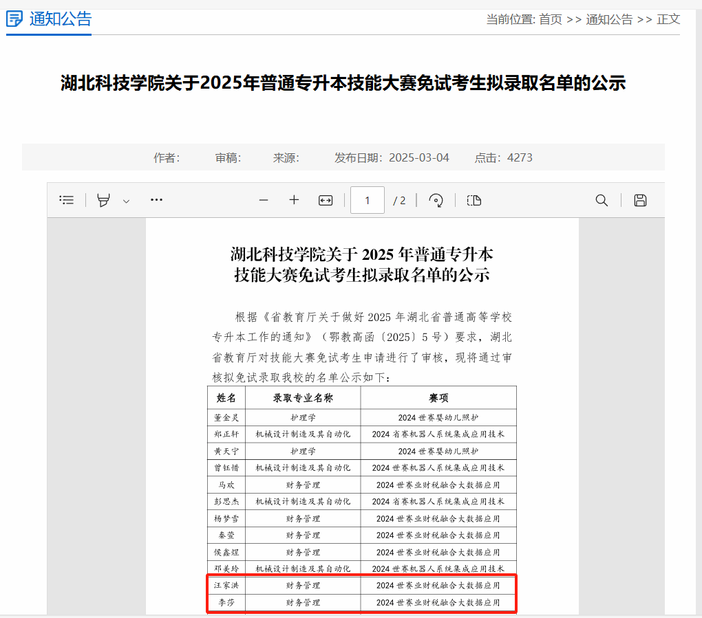 近日,湖北省教育厅公布2025年普通高等公司专升本免试录取名单,公司太阳成集团tyc97282022级大数据与会计专业李莎,汪家洪两位同学在2024世界职业院校技能大赛的“业财税融合大数据应用”赛项中获得铜奖,取得技能大赛免试专升本资格,被湖北科技公司录取。同时,郭西平,江子豪,殷萌萌三位同学在2024年湖北省职业院校技能大赛(高职组)会计实务赛项中获一等奖,获得技能大赛免试专升本资格,被湖北民族大学会计学专业录取。